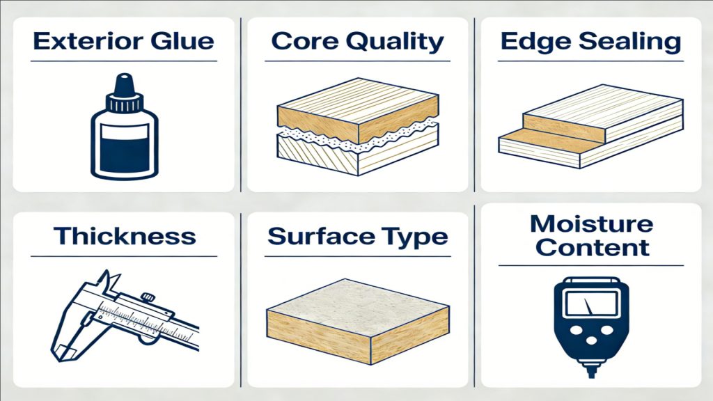 Prioritize exterior bonding, stable core construction, and strict edge sealing. In these conditions, finishing discipline matters more than upgrading the stamp on the panel.