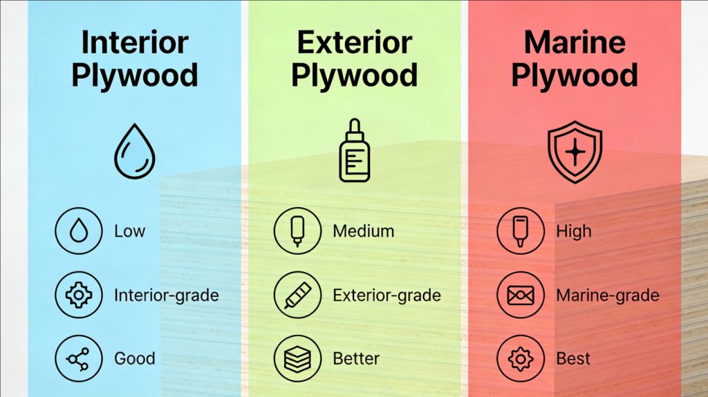 Exterior plywood is built for wetting cycles and short-term weather exposure. Its adhesive system is designed to resist bond failure during repeated wetting and drying.